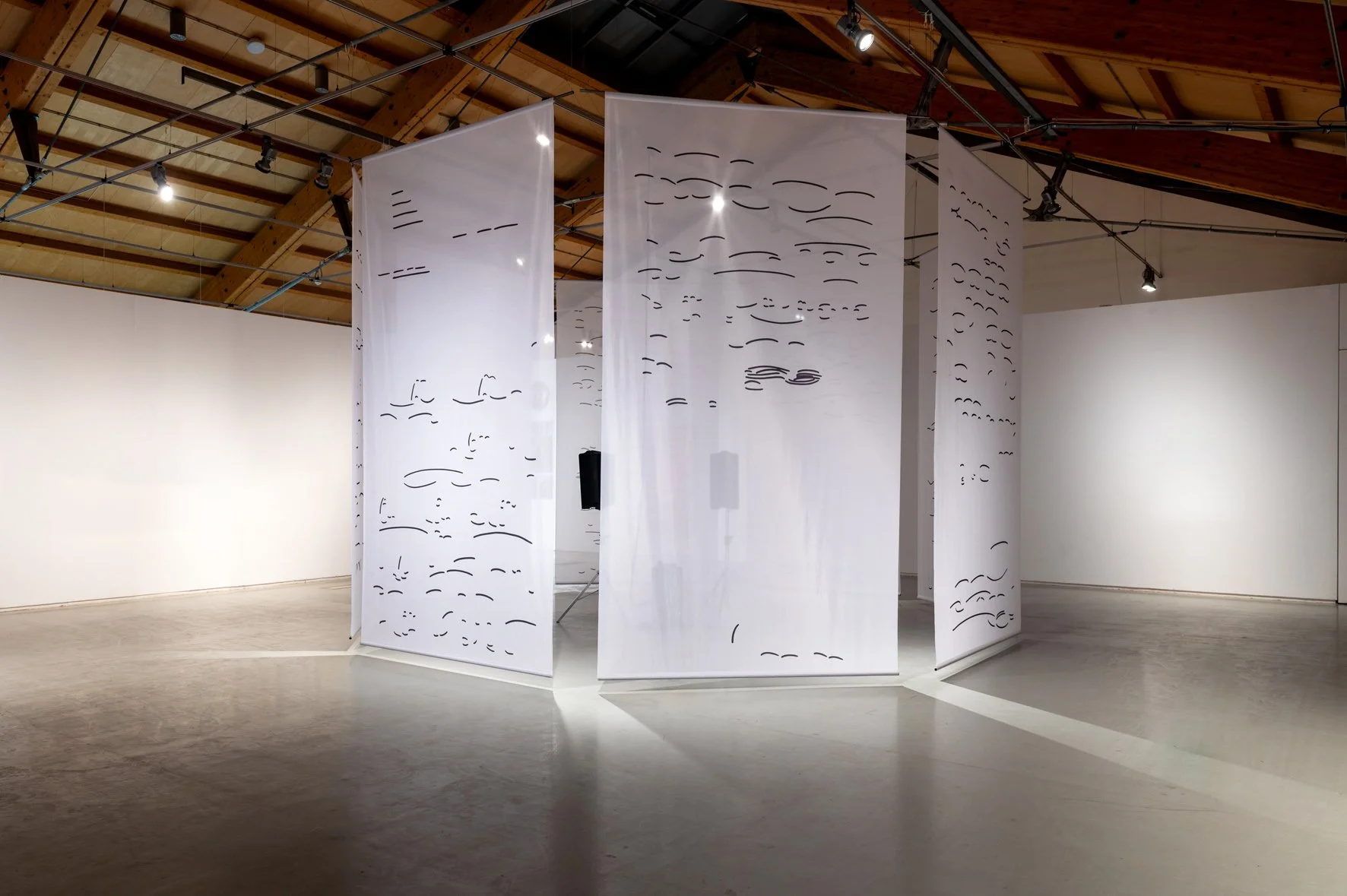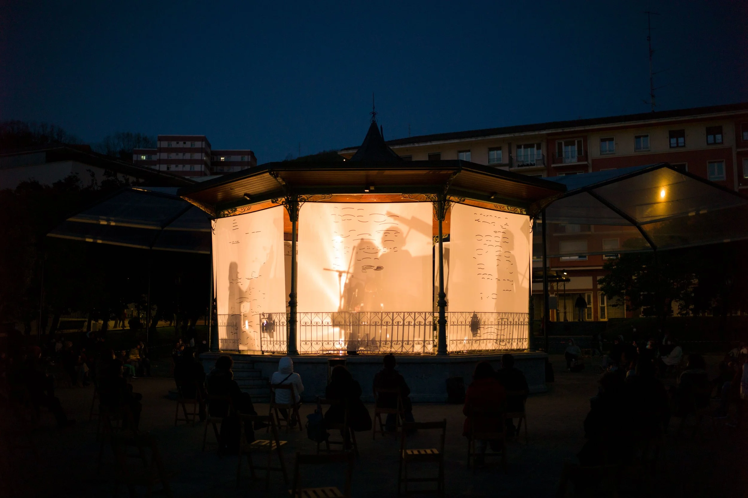 A raíz de su estancia en la cárcel de Santander, el compositor cántabro Arturo Dúo Vital (Castro Urdiales, 1901-1964) compone Seis canciones populares montañesas (1939), una serie de piano y voz que une la canción popular montañesa con la música clásica. A partir de una copia del manuscrito original, sigo las ligaduras dibujadas a mano por el propio compositor y creo una nueva caligrafía que apela al carácter abstracto de la música. Una sucesión de capas que se materializan en una intervención escultórica para el kiosco de la música. La instalación se compone de ocho textiles translúcidos impresos con las transcripciones de las seis canciones, y de la interpretación con piano y voz de las piezas originales.